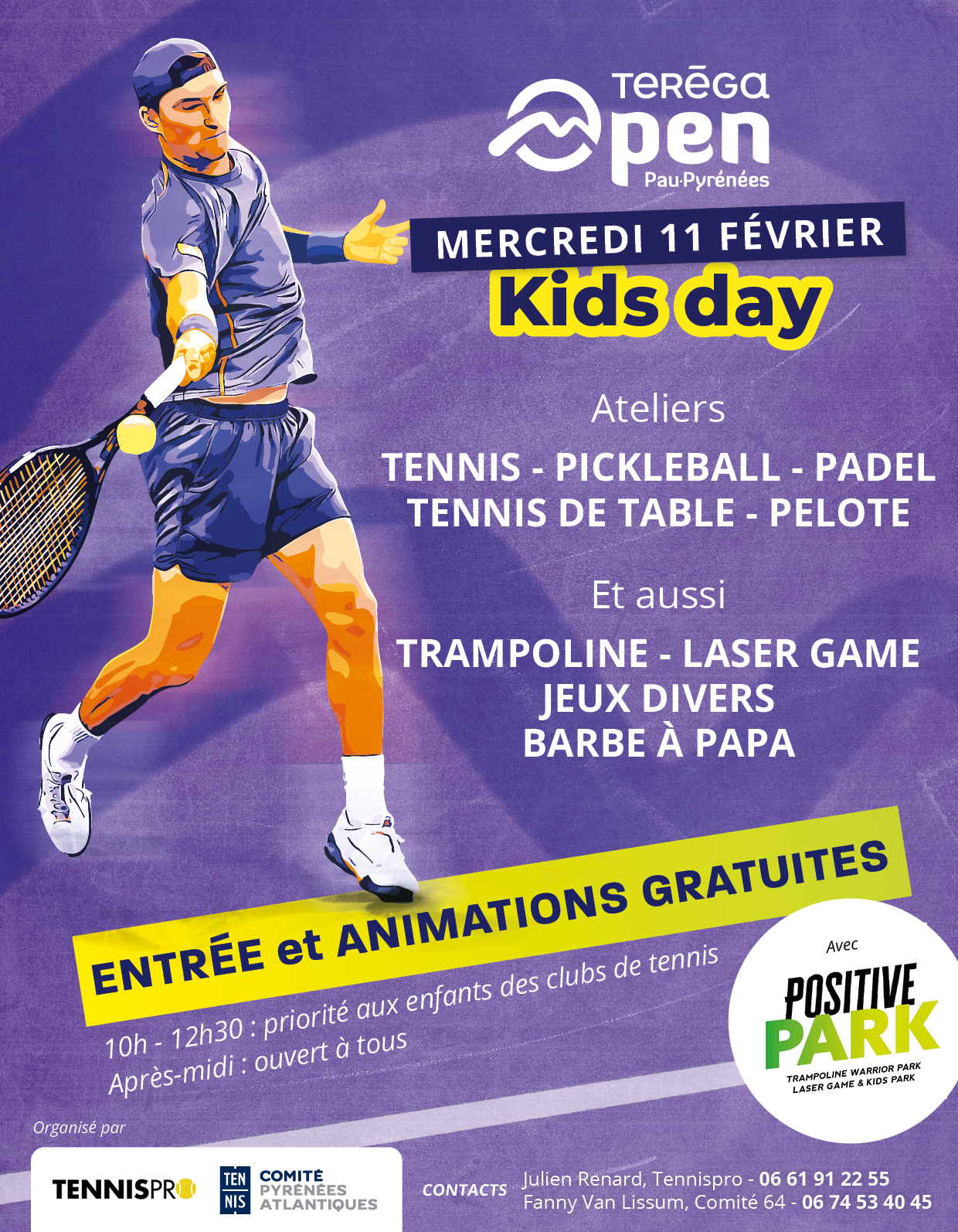 Ils pourront rencontrer les joueurs du tournoi, participer à des animations en tout genre (tennis, pickleball, padel, tennis de table, pelote, trampoline, laser game, jeux divers) et assister aux matchs du Teréga Open Pau-Pyrénées.